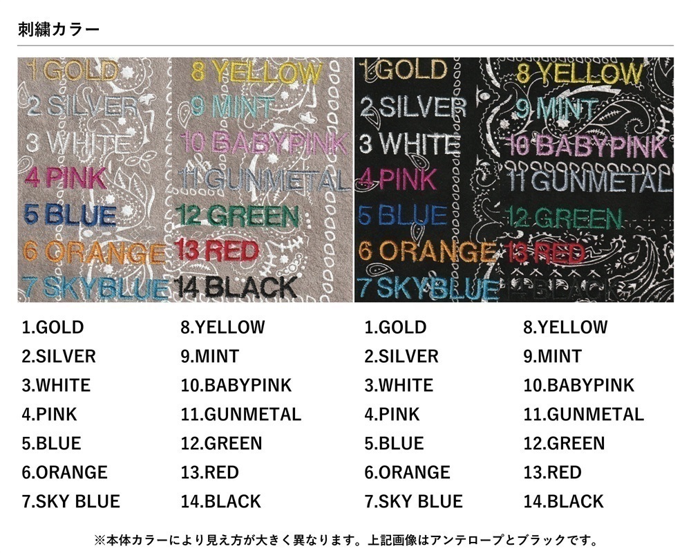 ・カラーは全14色ご用意しております。下記画像をご確認ください。※フォントタイプ3はホワイトの縁取りとなりますので文字色はホワイト以外でご指定くださいませ。